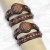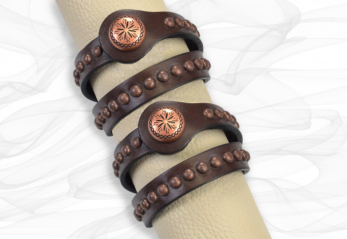 Copper Pony Double-Wrap Bracelet, a trendy southwest style bracelet. Engraved sunburst pattern antiqued copper spots give this bracelet a timeless apperance. Made here in our workroom from our premium chocolate brown belt leather. Pair it with our Copper Pony belt, it’s a great way to add color to a faded pair of jeans. 5/8″ wide 17″ long fits most wrists.
