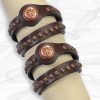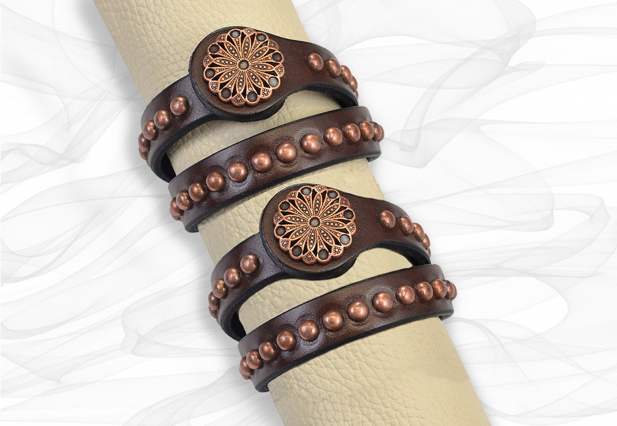 Copper Sunrise Double-Wrap Bracelet, made of our rich chocolate brown premium belt leather. Accented with a trendy antiqued copper flower concho and spots. Pair this with our Copper Sunrise belt for a unique look and everyone will want to know were you got it. This copper bracelet & belt develops a subtle patina over time, giving it a rich lustre. A great gift item, you can be sure they won’t already have. 5/8″ wide 17″ long, one size fits most wrists.