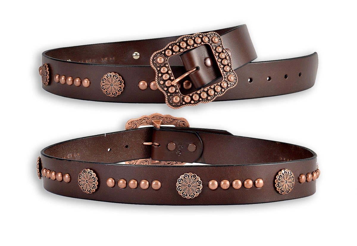 Copper Sunrise Ladies Spotted Belt, exquisite design for those wanting something unique. Antiqued copper spots set off with floral pattern copper conchos which add sparkle. Scalloped antiqued copper buckle. Made of 1 1/2″ wide deep Chocolate Brown 8-10 oz premium American leather here in our workroom. Hand rubbed finish for a luxurious feel. Wearing this belt you are sure to stand out in even the largest crowd. Tie it all together with our beautifully crafted matching Copper Sunrise double-wrap bracelet.