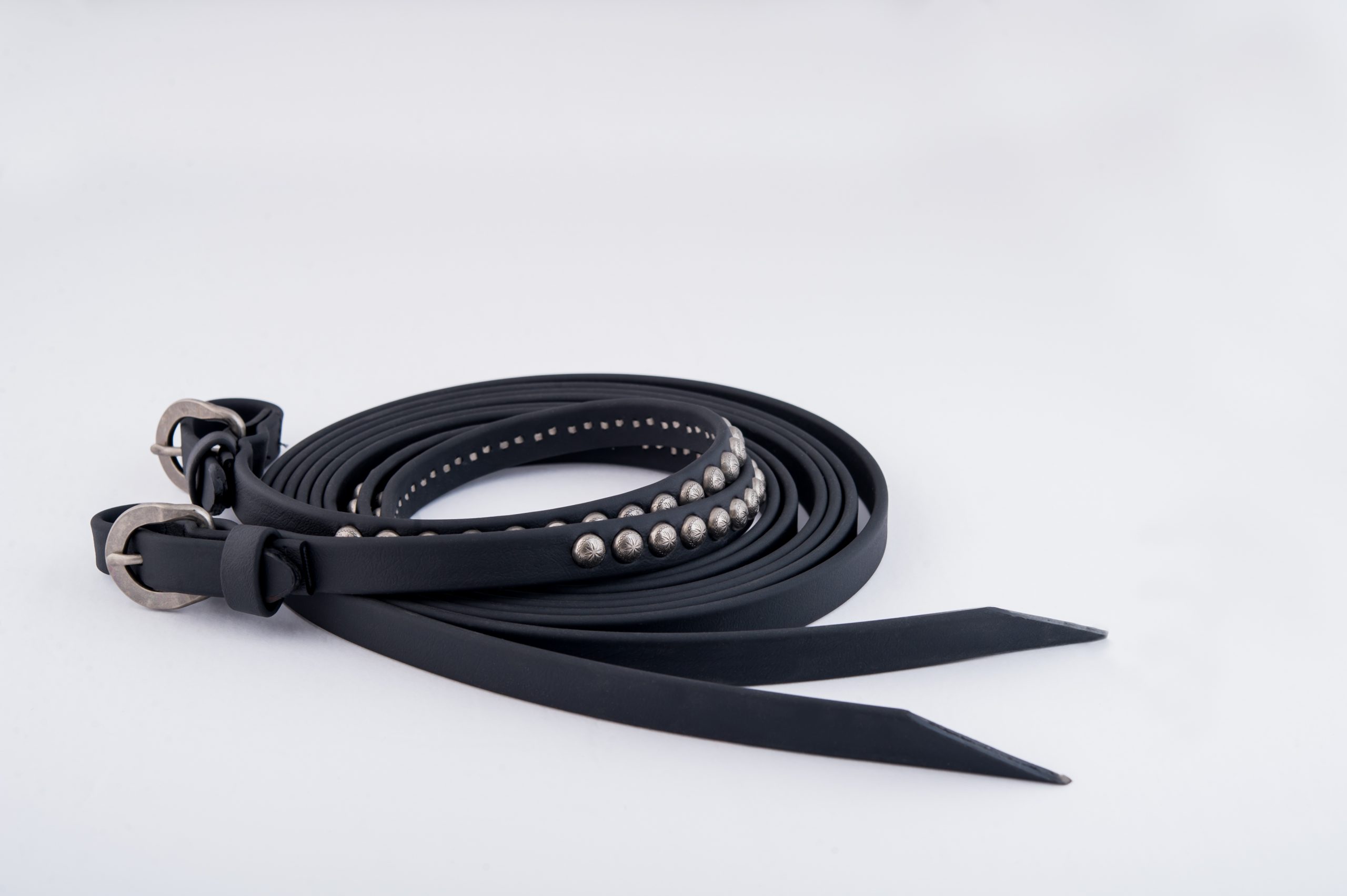 Deluxe Beta split reins are made in our workroom out of the highest quality 5/8” wide 7′ long Beta from Genuine BioThane USA. Sewn on steel Antiqued silver-tone buckles, reins are enhanced on each side with 12” of etched Sunburst pattern Antiqued silver-tone spots, to perfectly match our Deluxe Beta headstall. Available in your choice of Black or Brown.
