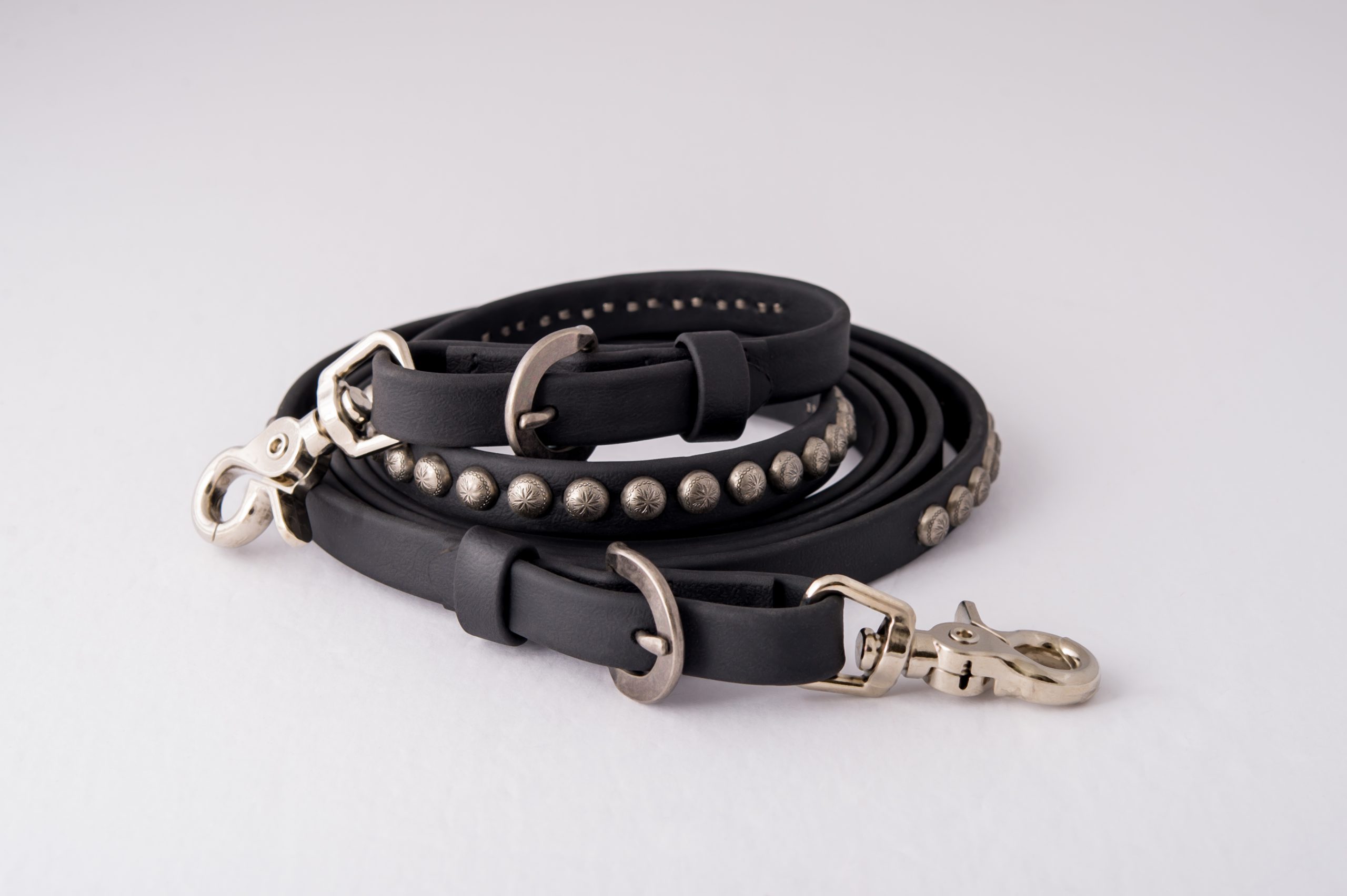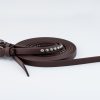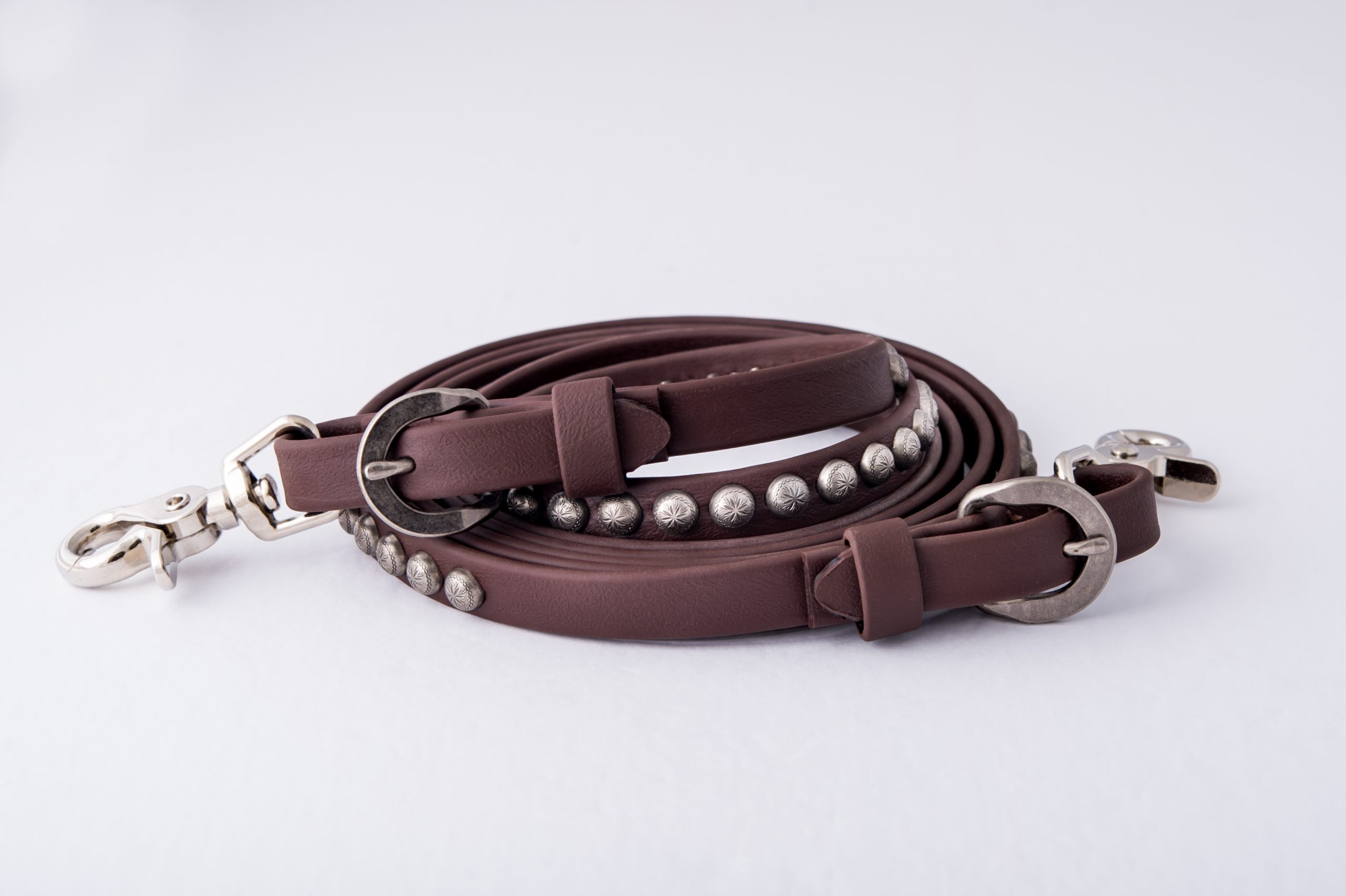 Deluxe Beta Trail Reins are made in our workroom out of the highest quality 5/8” wide 8′ long Beta from Genuine BioThane USA . Made of one continuous piece of Beta so you never have to worry about dropping a rein while out on the trail. Sewn-on steel antiqued silver-tone swedge buckles complete with bit snaps so you can unsnap one side for easy leading. Reins are enhanced on each side with 12” of etched Sunburst pattern Antiqued silver-tone spots to perfectly match our Deluxe Beta headstall. Available in your choice of Black or Brown.