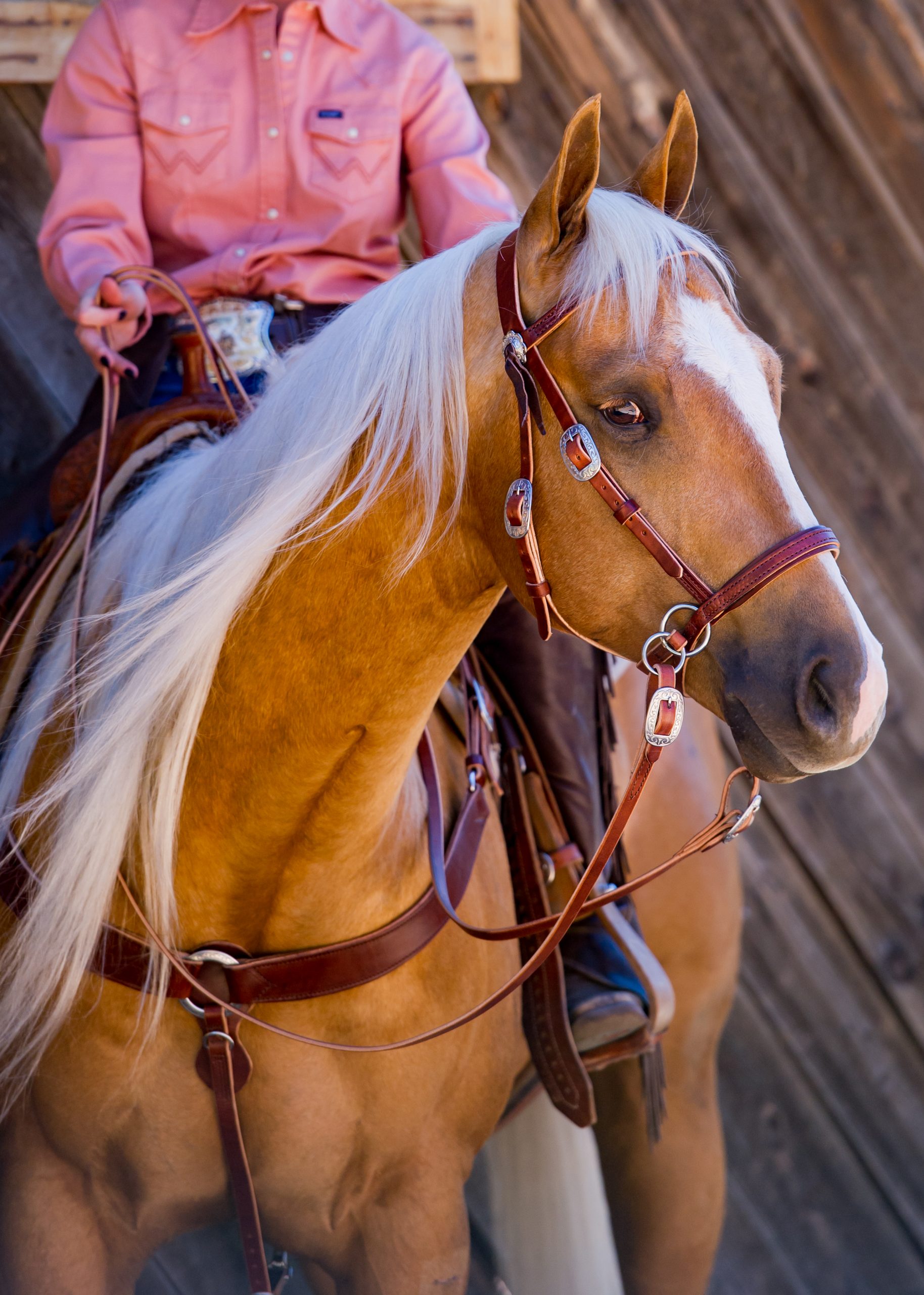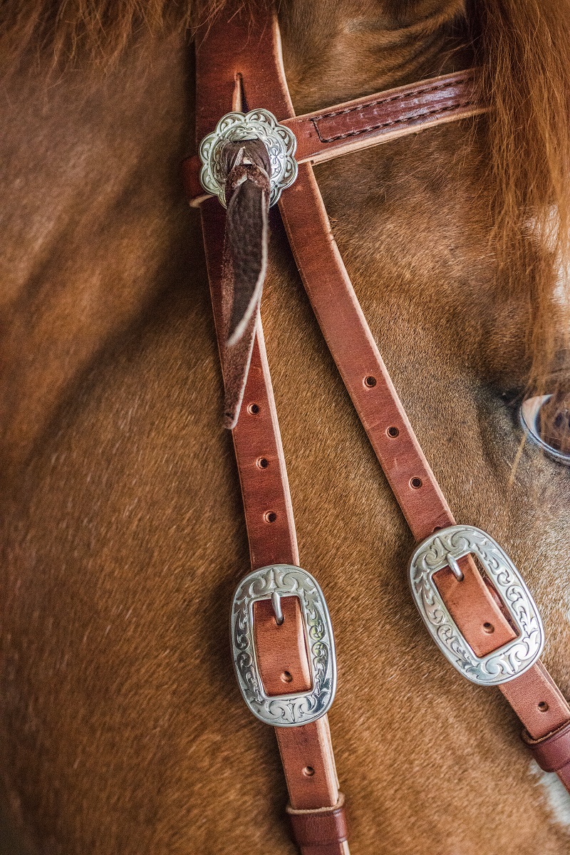 Deluxe Harness Leather Headstalls are made in our workroom out of premium #1 grade Wickett & Craig tanned, richly colored medium brown harness leather. First choice of top professional horsemen for feel and weight. Finished with rich, chocolate brown stitching. Hand rubbed finish for the feel you can only get from top quality harness leather. This bridle is complimented with floral pattern polished stainless steel Horse Shoe Brand buckles “by Jeremy Watt”, and the oval center bar buckle has been designed to fit closer to the horse’s head. Also features decorative floral patterned stainless steel conchos complete with chocolate brown buffalo hide leather ties. Roller buckle at the chin for easy adjustment. The leather develops a deep, rich patina with use, and is easily cleaned with just a little saddle soap. If you want to look like this is not your first Rodeo, this is the bridle for you.