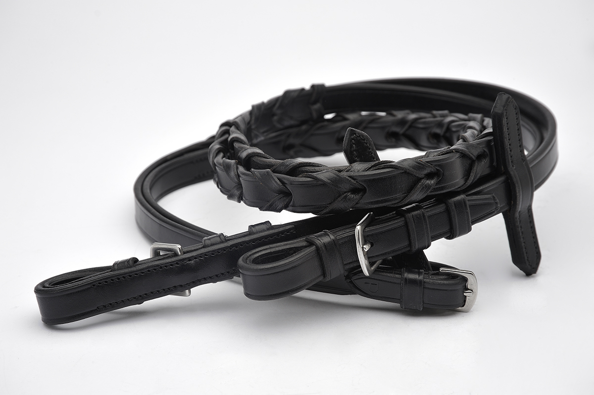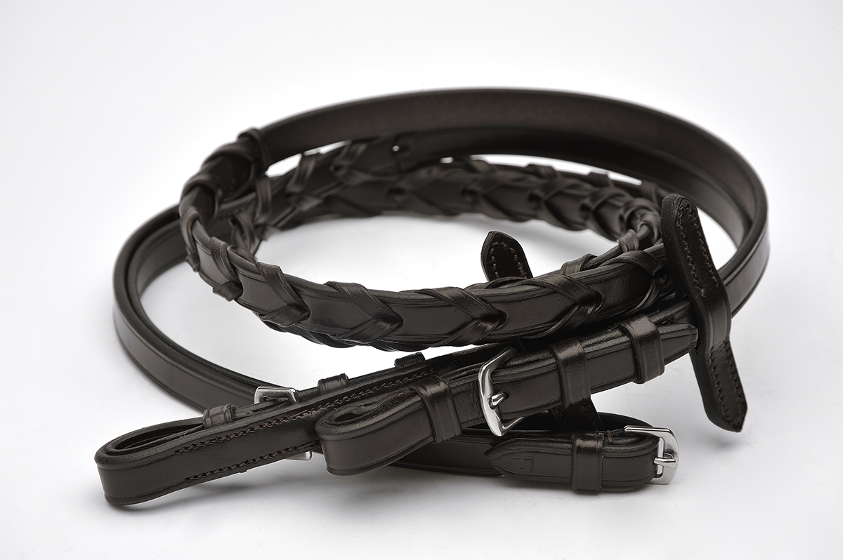 Laced English Leather Reins are made 5/8” wide 54′ long, out of genuine Sedgwicks of England English Bridle leather to match all our English Bridles. Available in Havana Brown, Black, or English Tan.