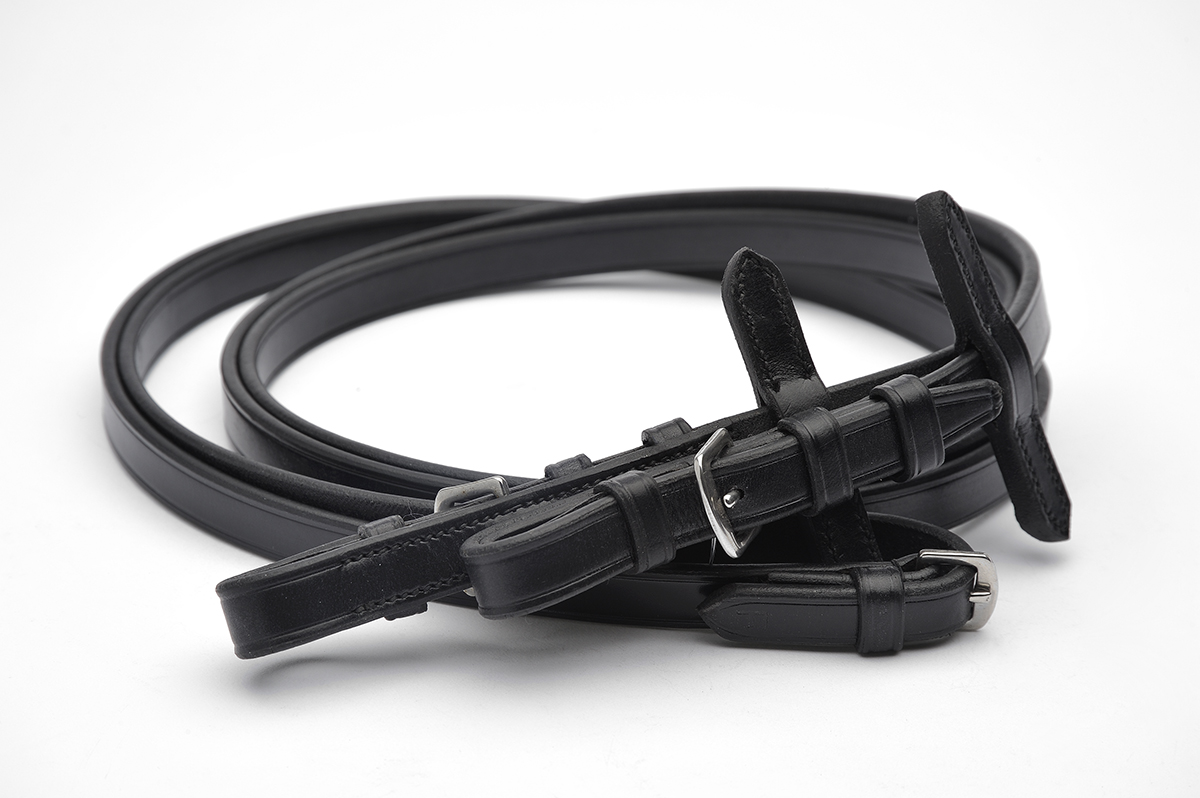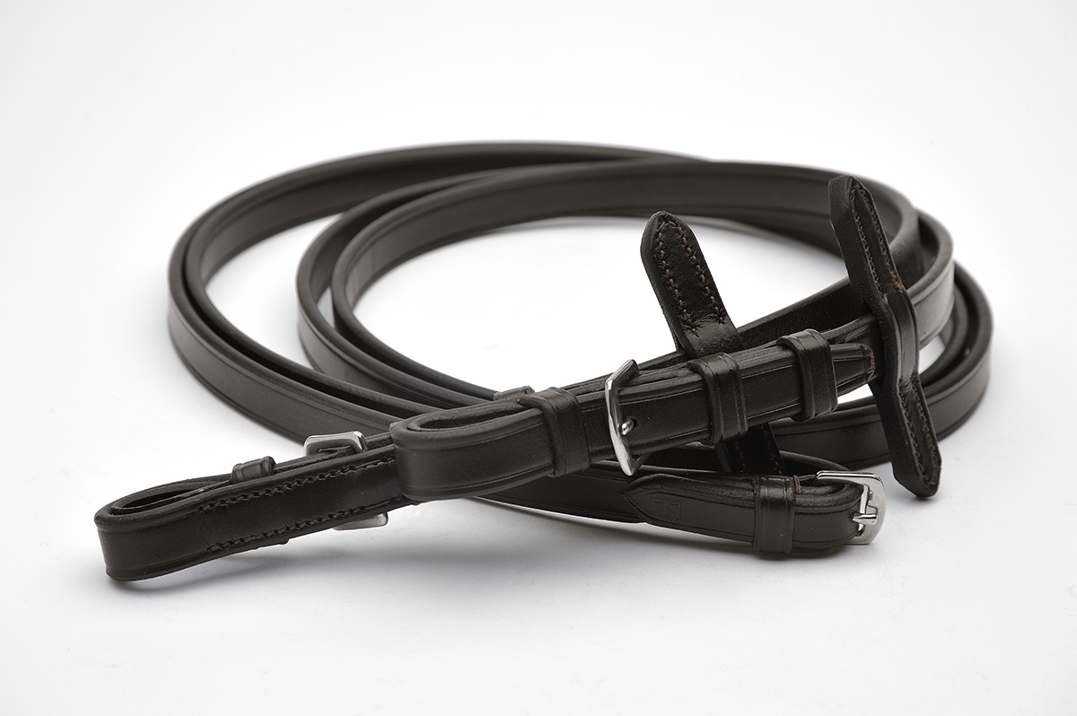 Flat English Leather Reins are made 5/8” wide 54′ long, out of genuine Sedgwicks of England English Bridle leather to match all our English Bridles. Available in Havana Brown, Black, or English Tan.