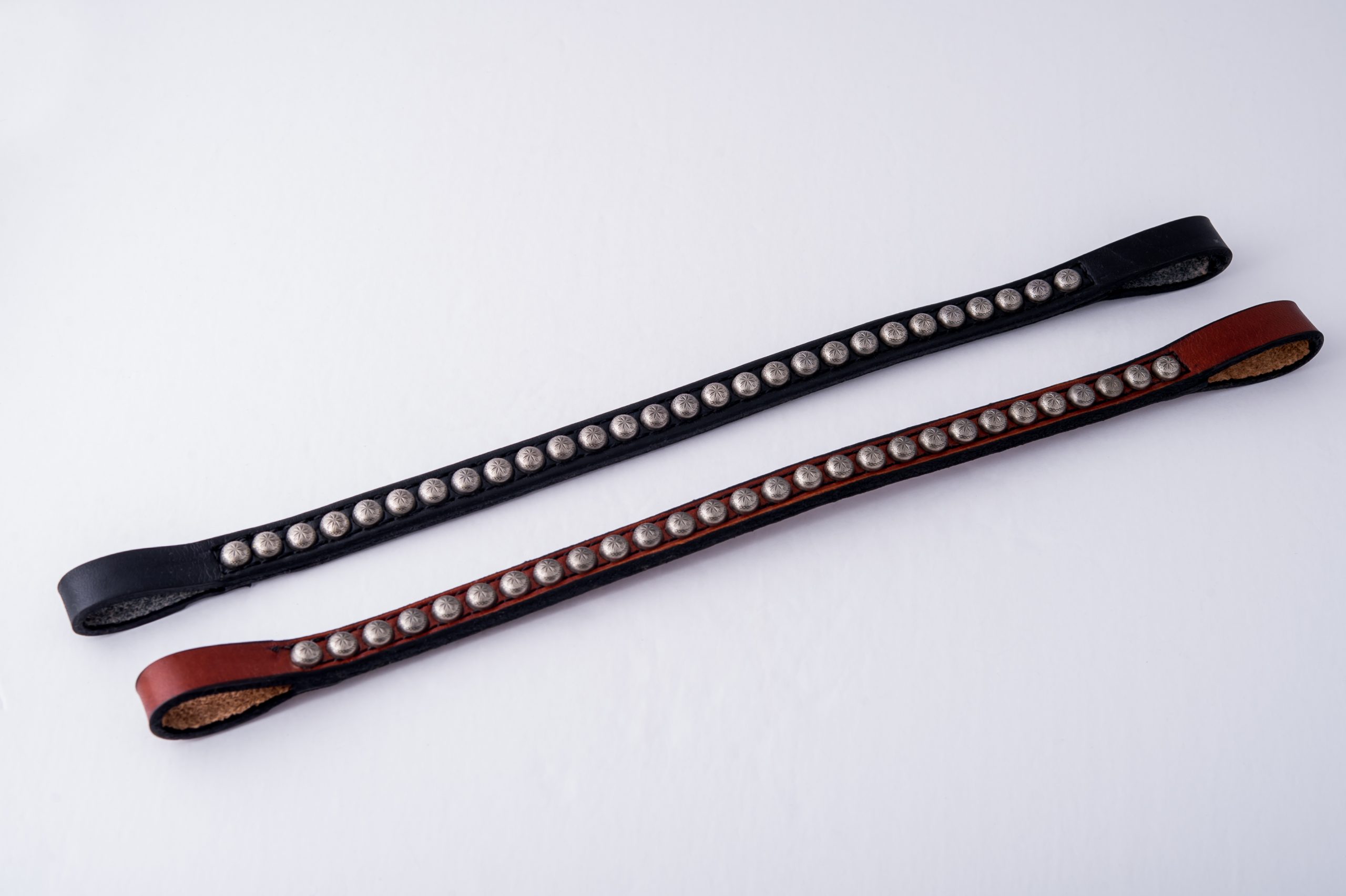 This double sewn leather browband is made in our workroom out of the same #1 grade Wickett and Craig English Bridle Leather, that we use for our Western headstalls. We have enhanced this browband with a row of etched sunburst pattern Antiqued Silver Spots, these really sparkle in the sunlight.