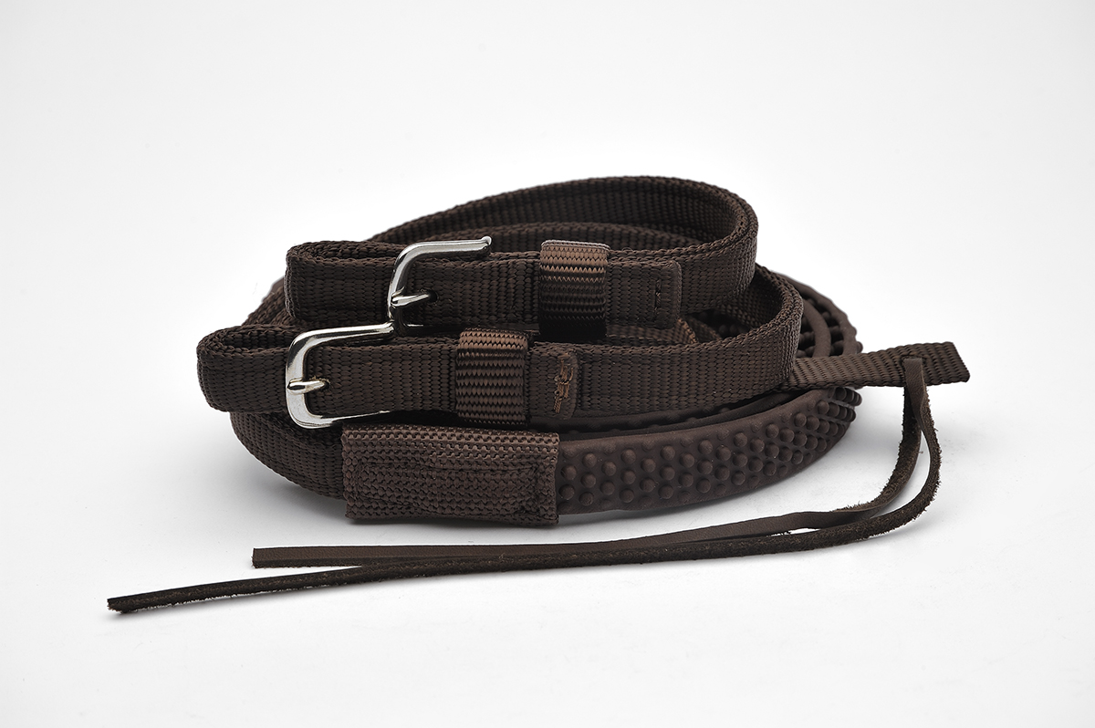 Nylon reins are made in the USA from premium triple-ply nylon webbing and solid rubber-grips in the center . They are split reins with the option to tie together at the ends with a rawhide string. Stainless steel hardware that will not rust. Overall length 55″.