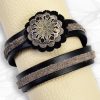 Spring Daisy Double-Wrap Bracelet, this versatile double-wrap bracelet can also be worn as a choker. Made from the same Premium leather as our belts. Cute worn by themselves or wrap-em and stack-em with our other bracelets. Looks great with a pair of jeans or add some color to your show outfit. This white enameled daisy with perlized turquoise center will brighten your day. Comes in your choice of Black or Chocolate Brown. Matches our Daisy belt perfectly. 5/8″ wide 17″ long fits most wrists, making this the perfect gift when you need a gift and don’t know size.