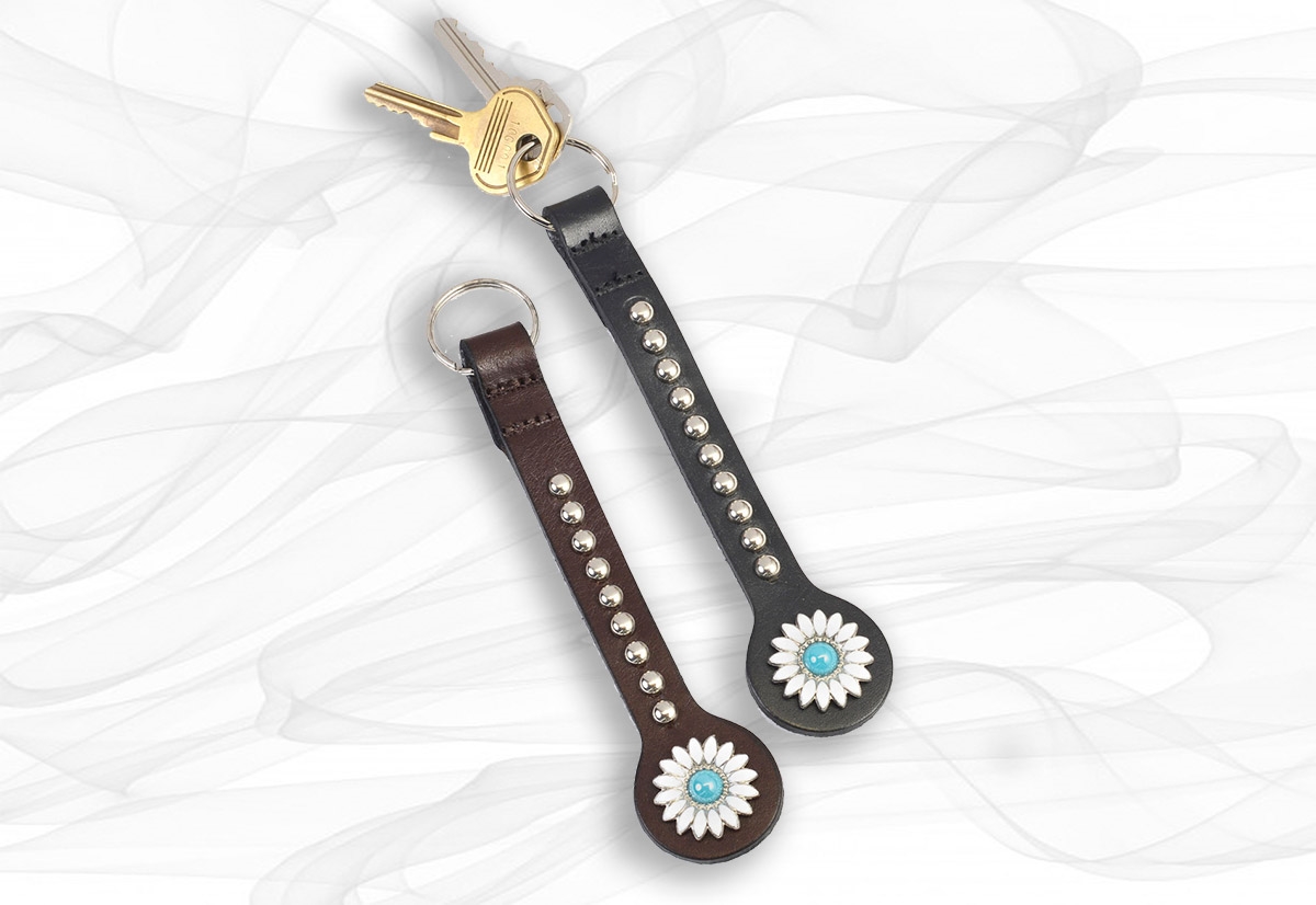Spring Daisy Key Fob, this is not your normal key fob. This versatile fob can be used for Keys,Hoof Pick,Bag Zipper Pull, Gate openers, and many other small items that are always being lost or missplaced. Made with the Same Premium leather as our belts,comes complete with 1″ key ring. Your choice of Black or Chocolate Brown leather with white & turquoise daisy & silver spots.